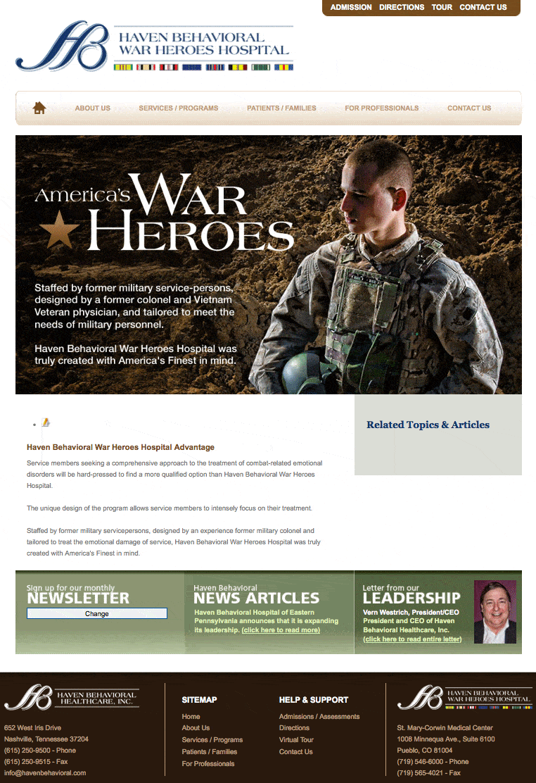 Following their branding guidelines, we have built their website on a content-management-system with integrated SEO features and Youtube and Google Maps integration. Customized forms and downloadable brochure PDFs help make this website both an informational and marketing showpiece for the Haven War Heroes Hospital program.